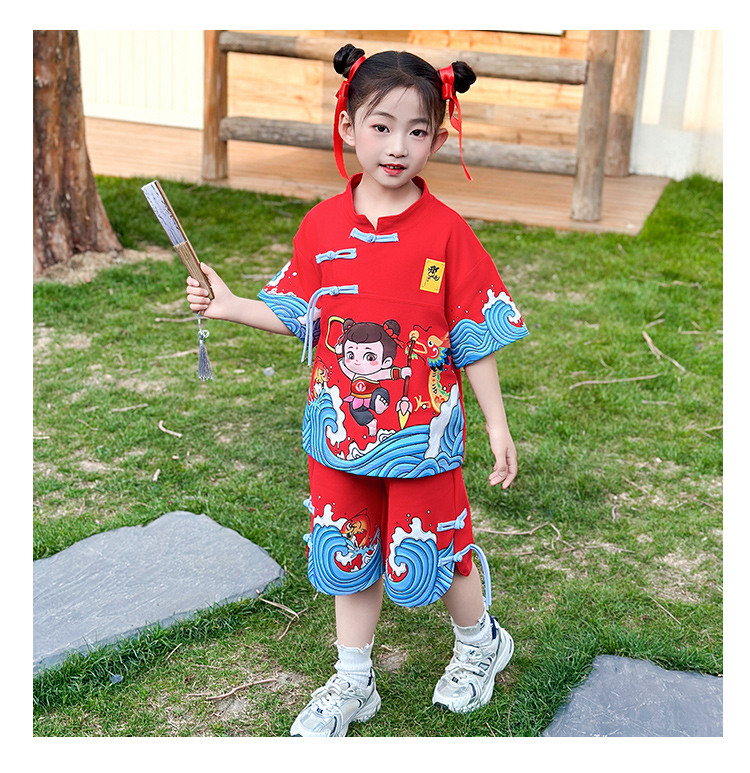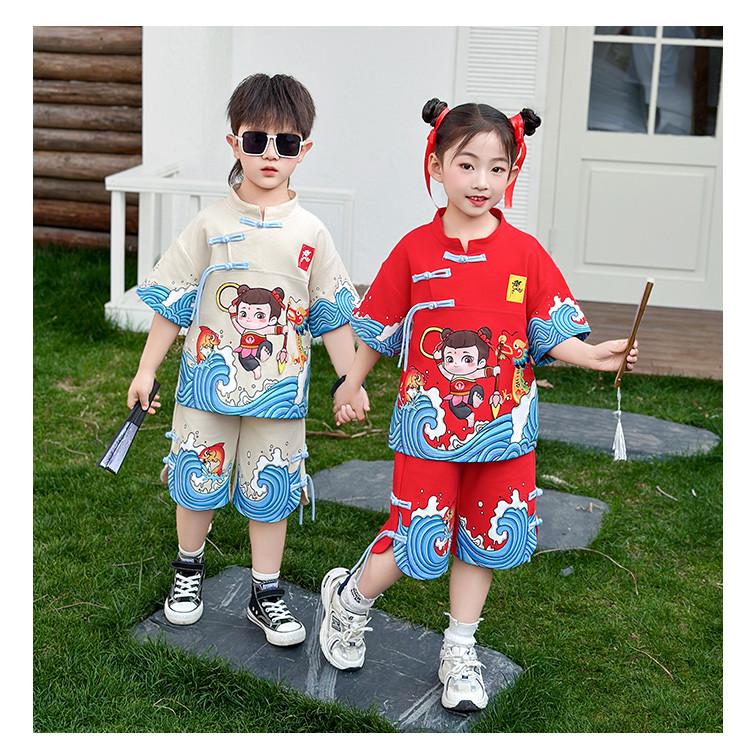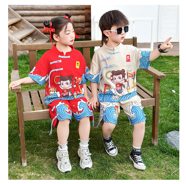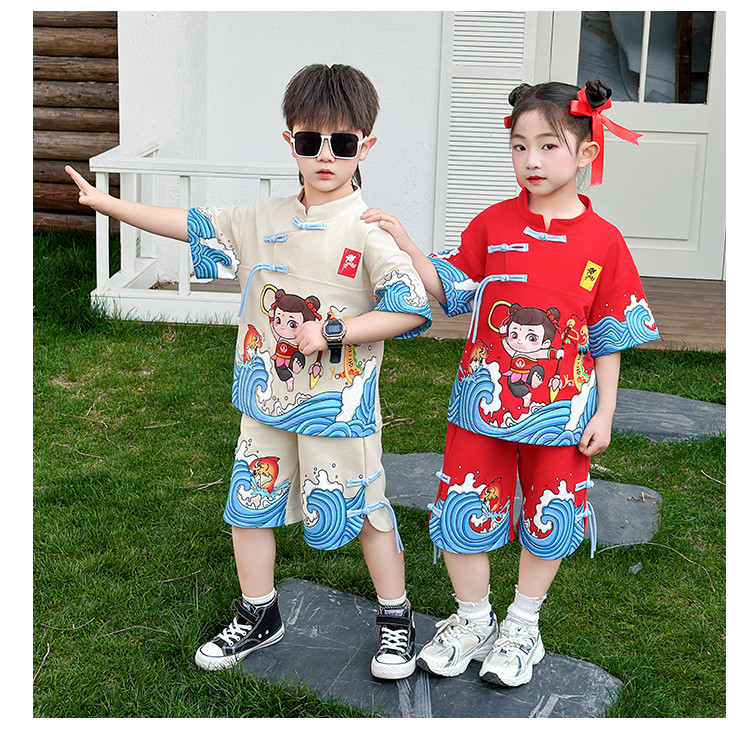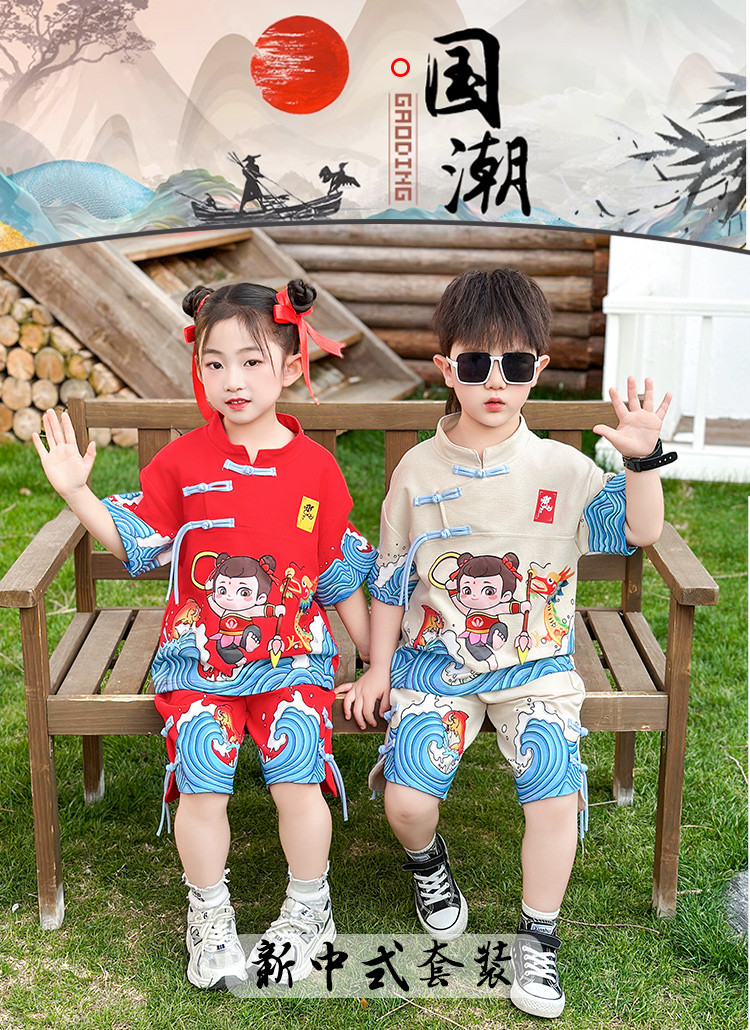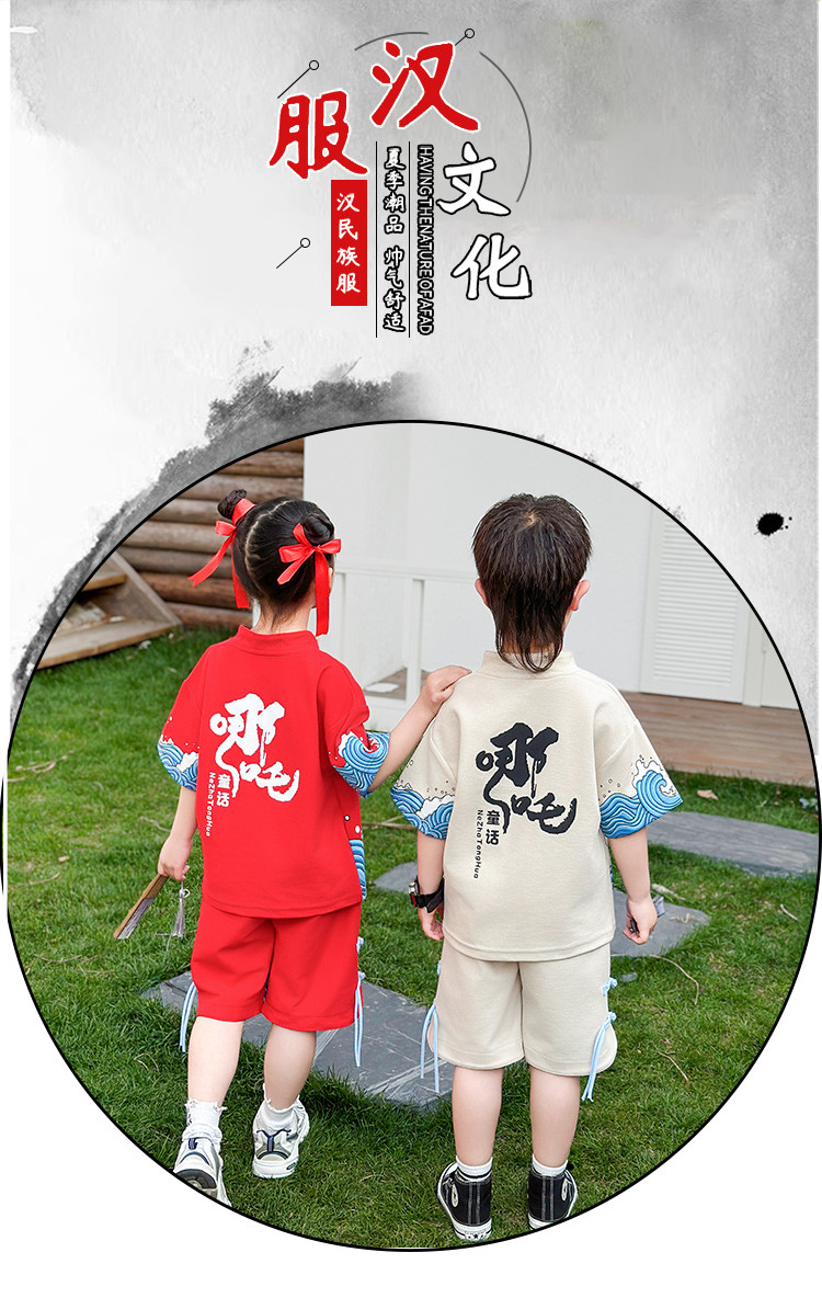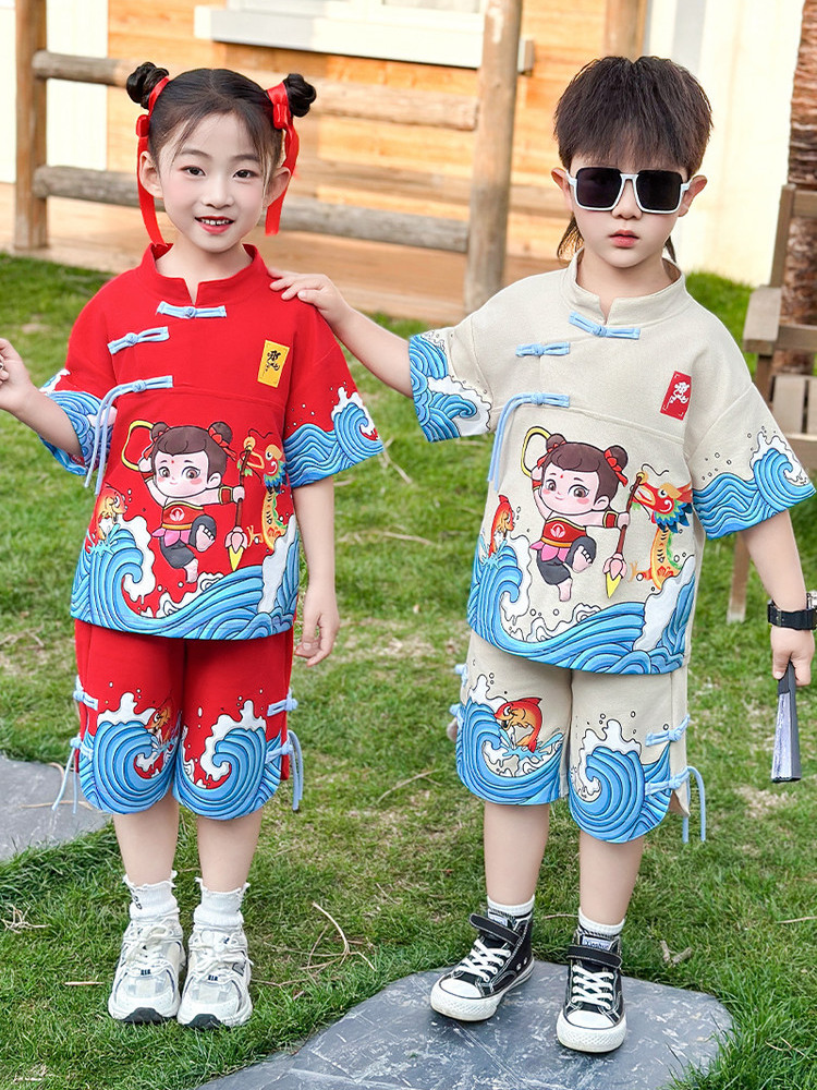 Children's Hanfu Summer Short-Sleeved Outfit, Nezha Clothing for Boys, Chinese Style Summer Clothing for Little Girls, New Chinese-Style Thin Tang Suit