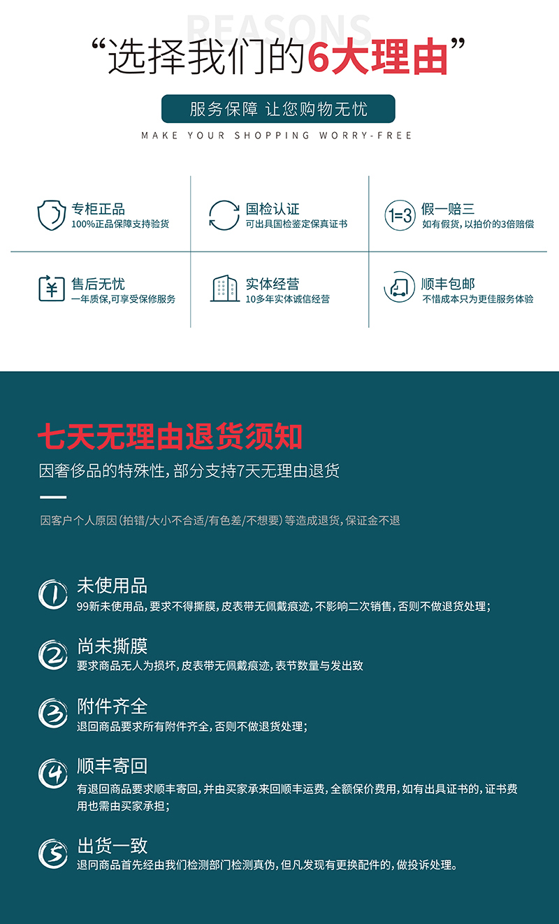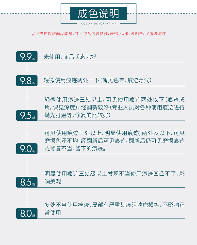 备注: | 市场参考价格 : (仅供参考) 因品牌方产品型号众多,本商品系列/型号未能详细核实,介意者慎拍; 备注: 如需国检、中检、华测请提前联系客服,提供送检(送检需要时间7-15天,部分老款表因年限问题无法办理敬请谅解); 本店所售金属材质二手腕表腕周男表为 160-170mm,女表为145mm-160mm。因个人佩戴习惯不同,具体手围可发给客服提前咨询,表节超出部分需另购。二手腕表皮表带均为,副厂后配全新皮表带。 |