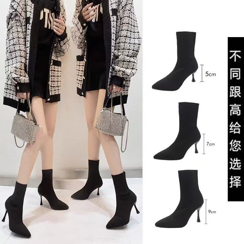 2025 New Autumn and Winter Women's Shoes Boots Versatile Short Boots Pointed Toe Stiletto High Heel Boots Knitted Elastic Boots Sock Boots
