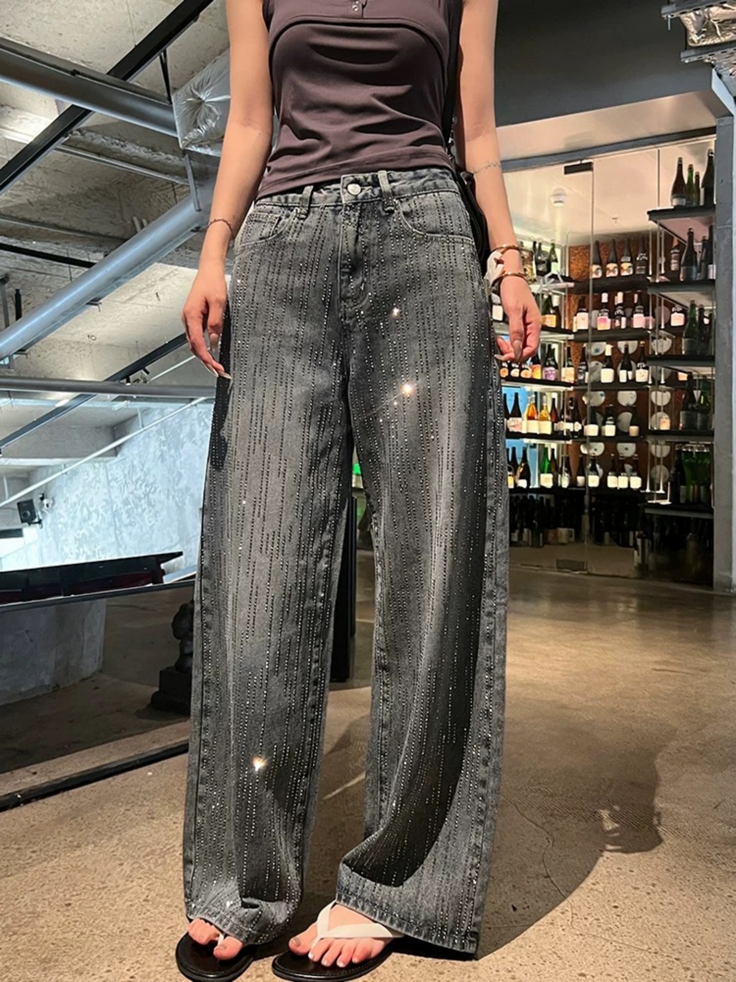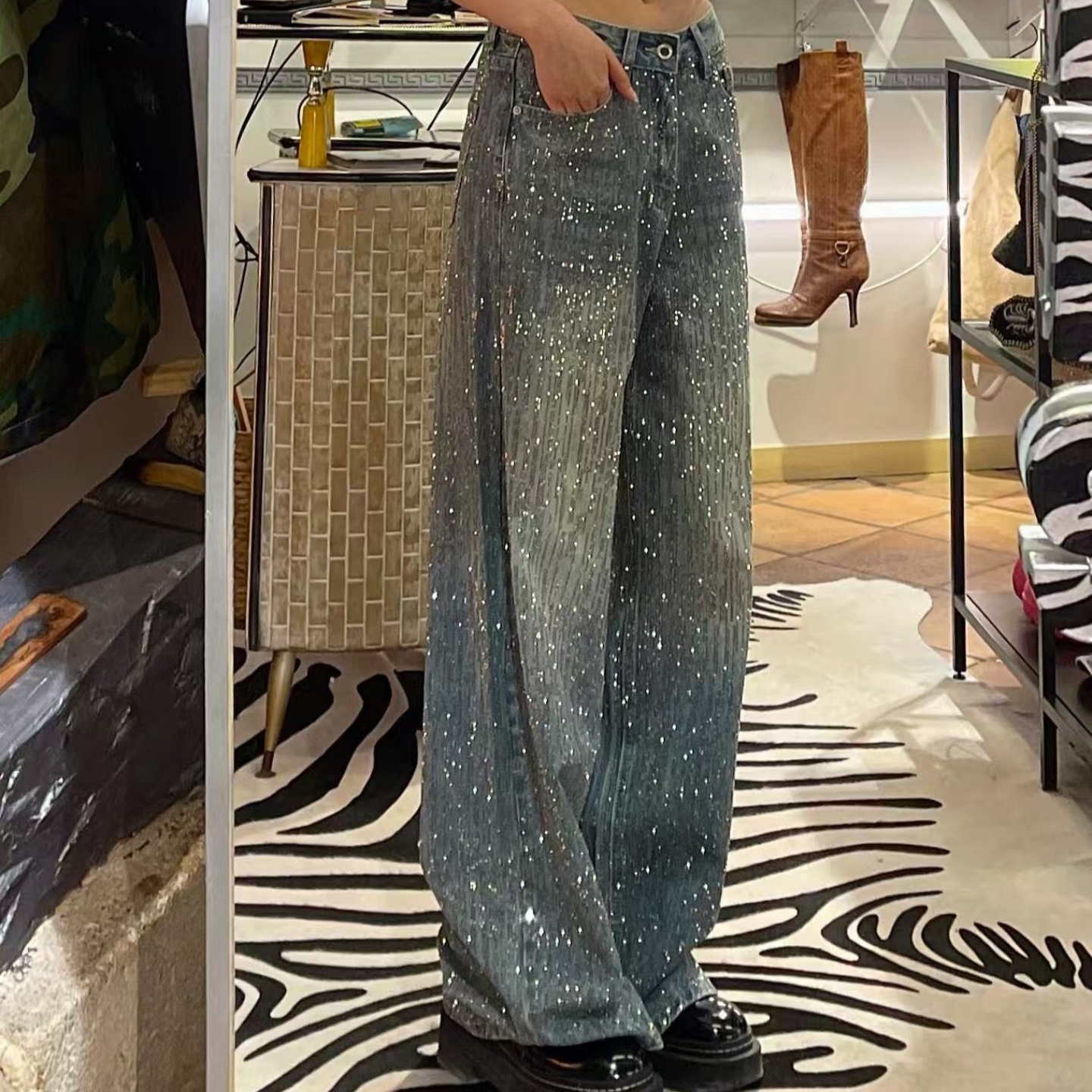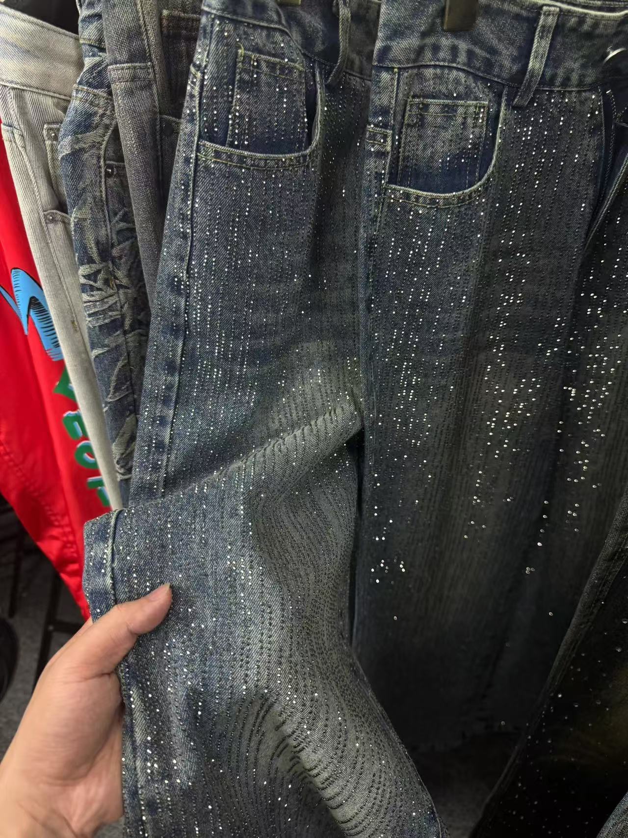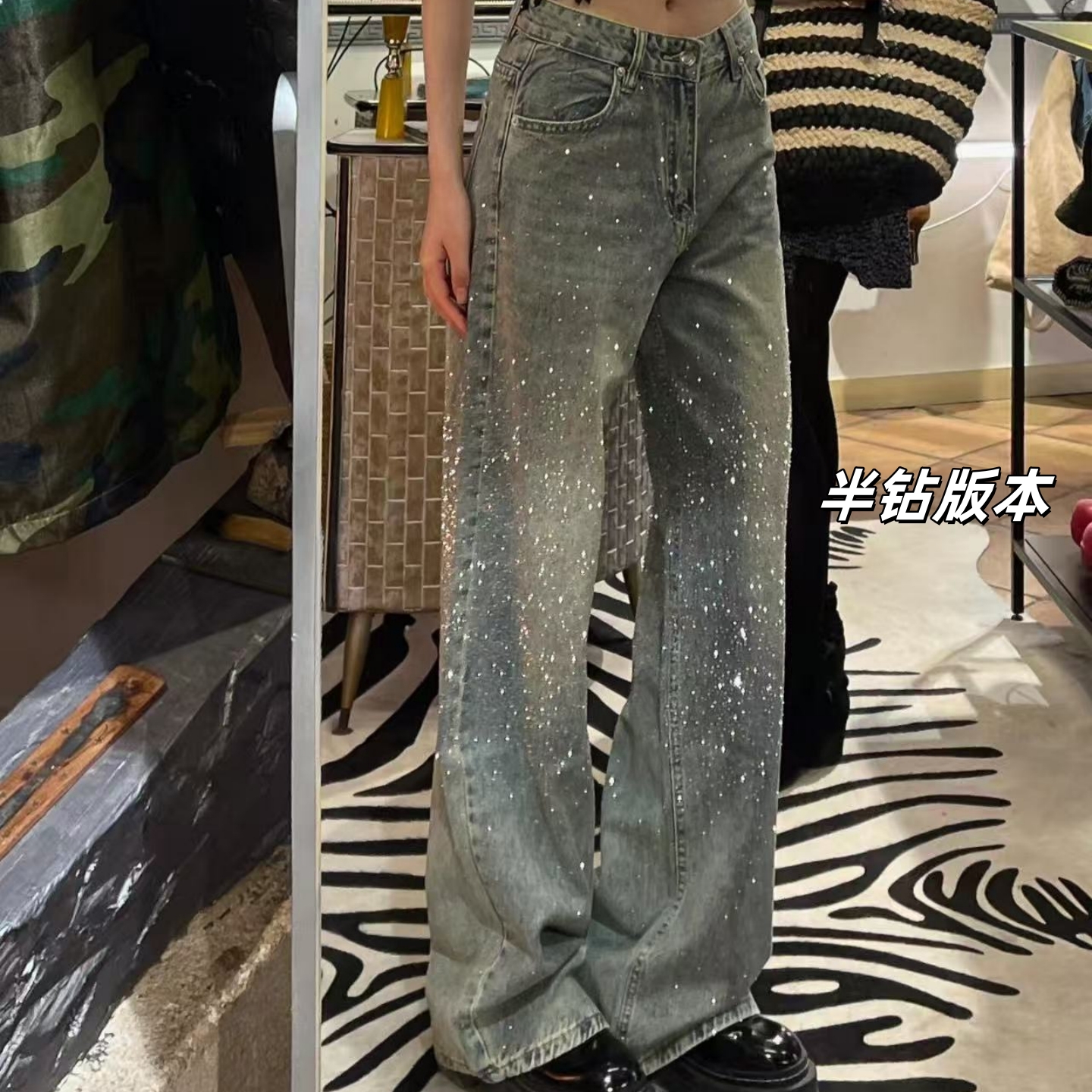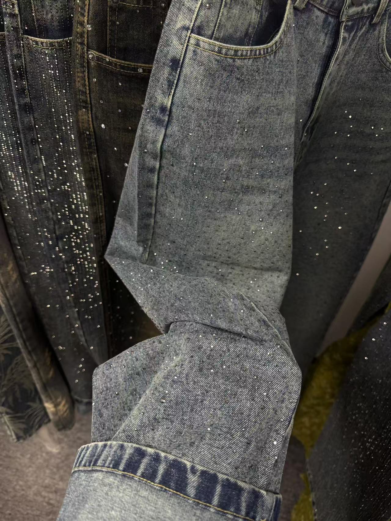 全钻:水洗复古色 也是阔腿版型 这条会更长更闪 感觉适合出去玩拍照穿