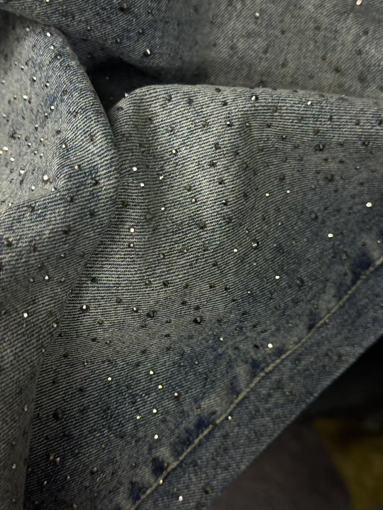 宝宝们刚收到货可能会有一点点烫钻的热压味道,可以晾在阴凉处风吹一下,裤子正反面满钻,所以侧面裤缝和裤脚都会有偶尔重合或者不牢固的,掉落不影响正反美观 属于正常情况