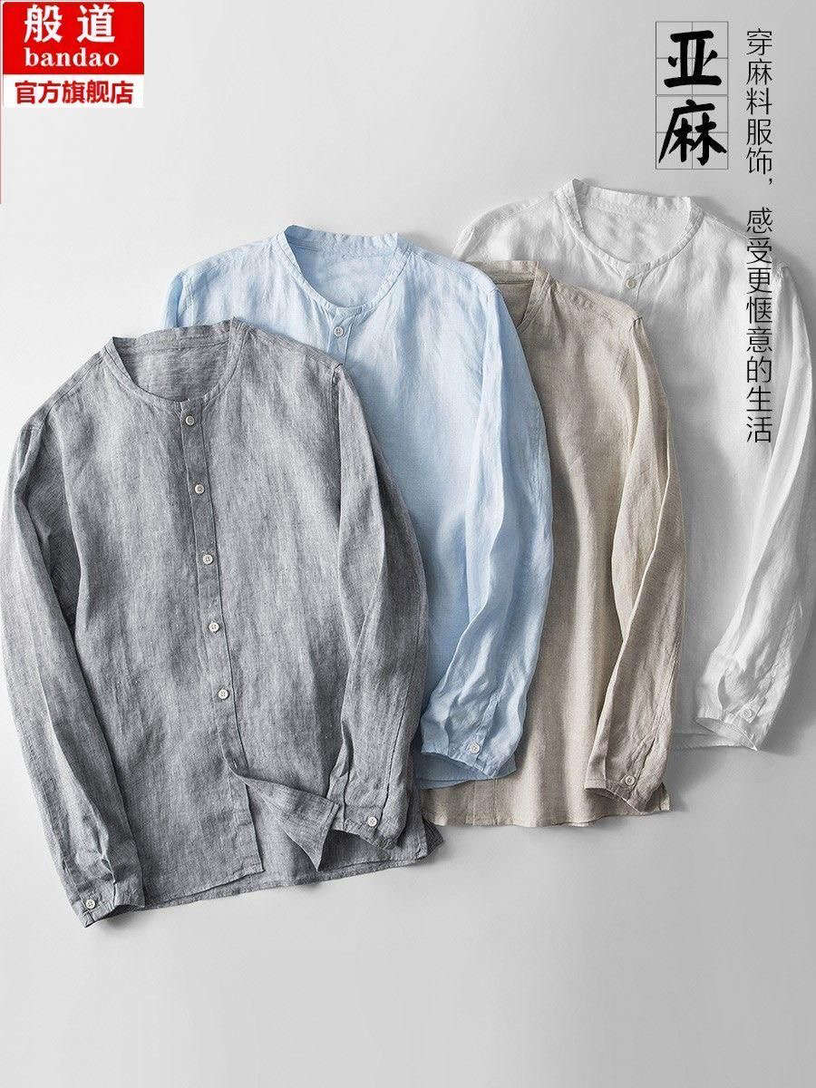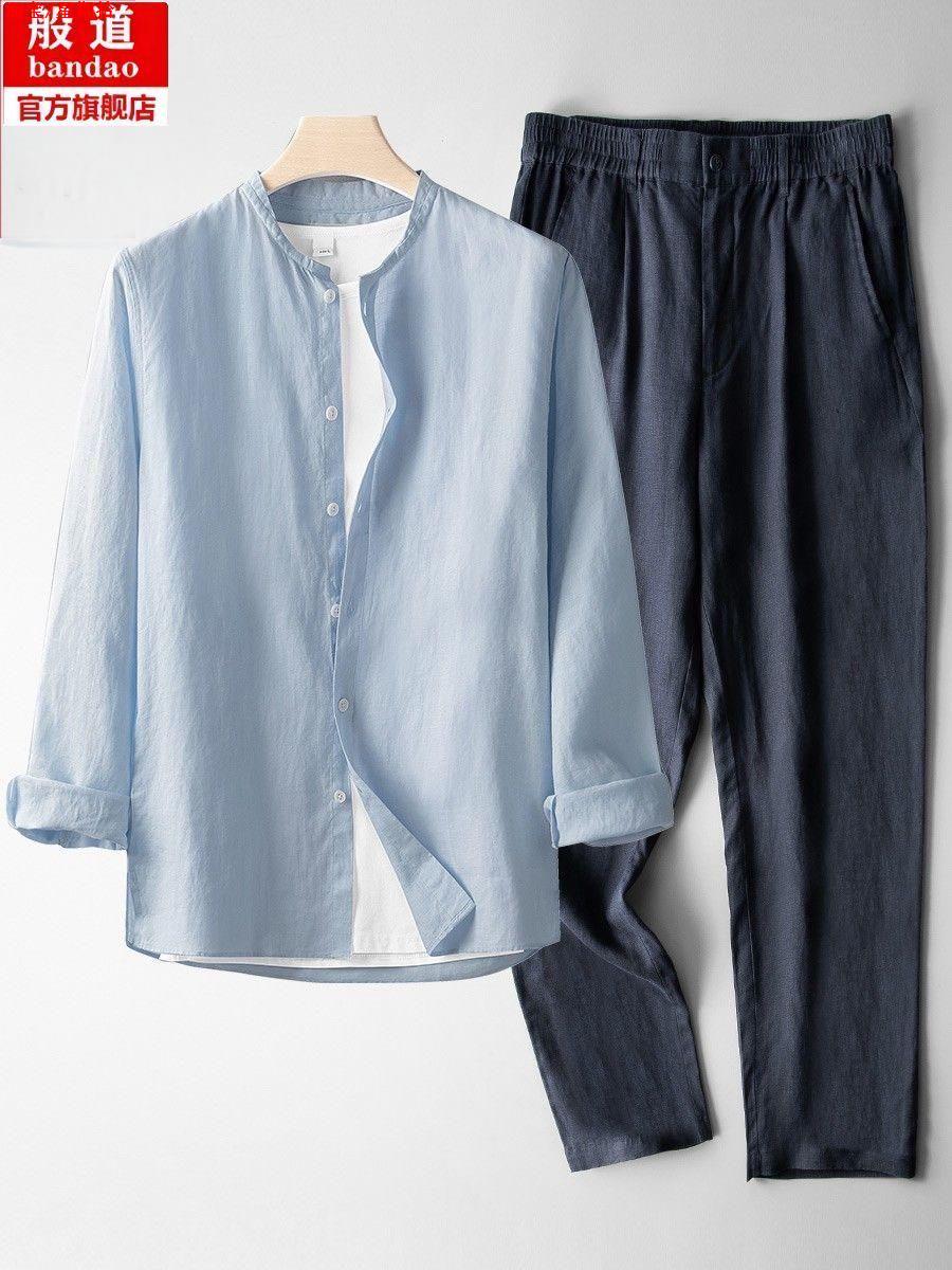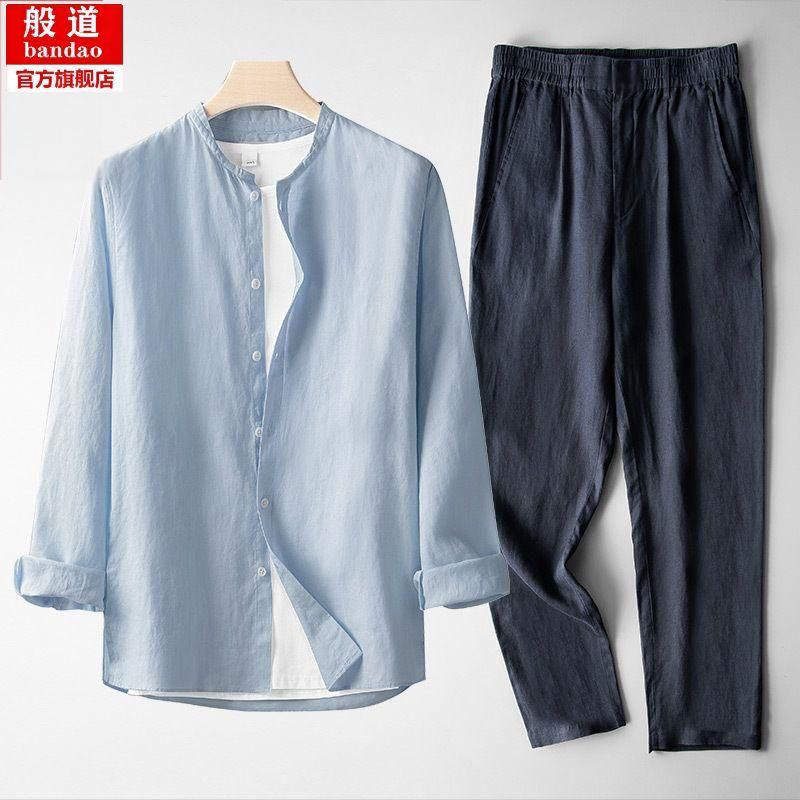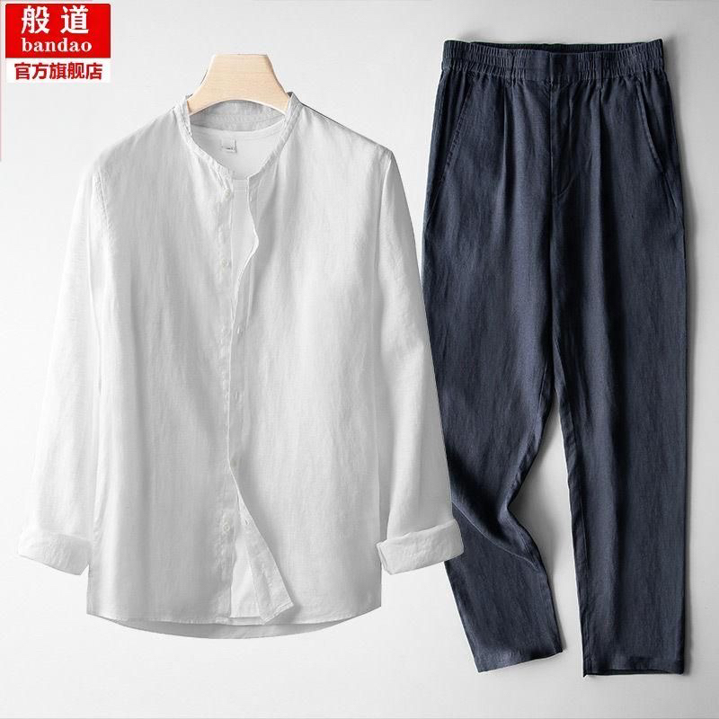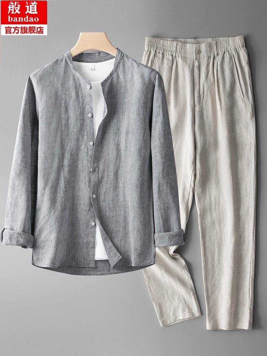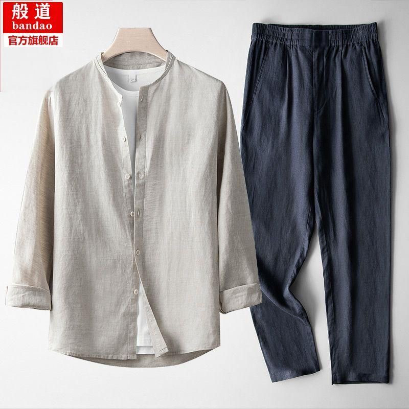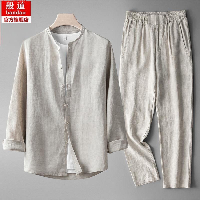 Linen Shirt Men's Spring & Fall Summer Long-Sleeved Thin Casual Loose Cotton and Linen Shirt Pants Men's Linen Suit